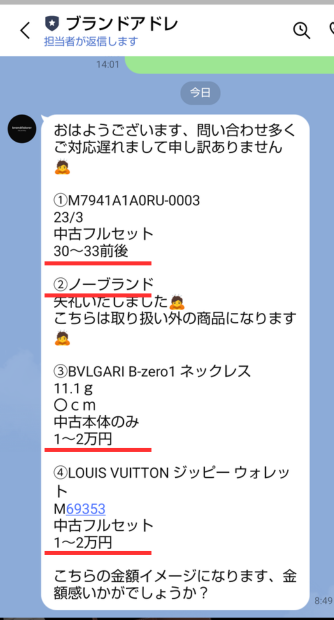 ブランドアドレの口コミを調べると、評判が悪い理由の一つにLINE査定の返信がないことが挙げられていました。一方で買取は評価が高く、減額なしでどこよりも高額だったという声が多かったです。