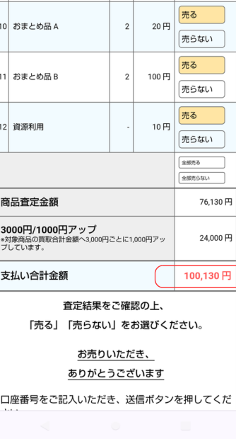 全部で100,130円になりました。結構な金額にビックリです。意外と買取が高いと思いました。